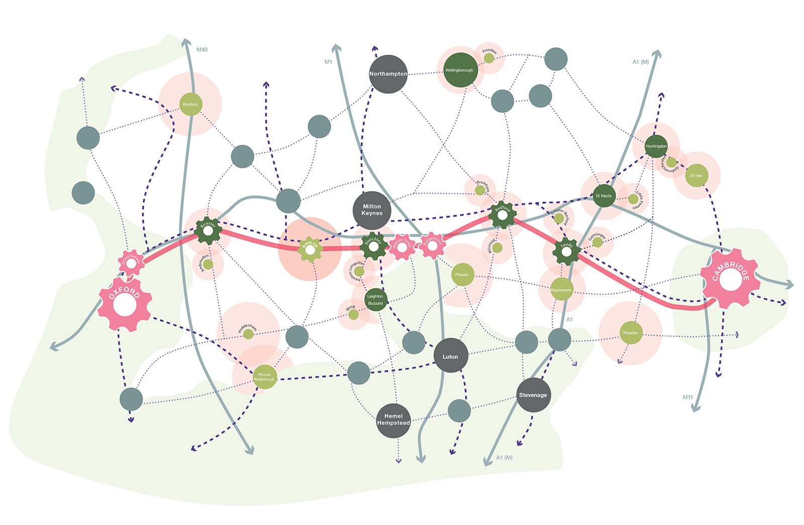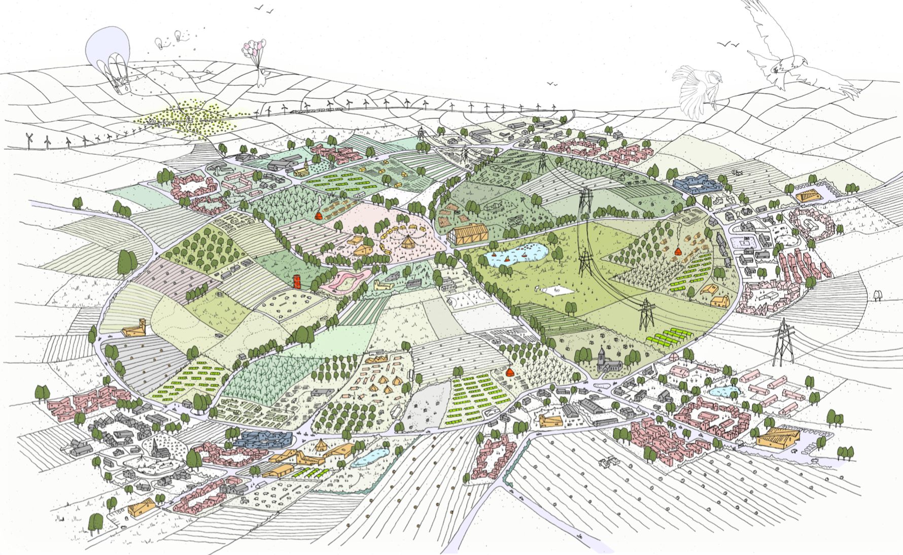 Our vision has been developed to enrich village life and a sense of place, while creating new homes and working environments in healthy and socially cohesive places. It comprises a ‘polycentric’ cluster of new and ‘expanded’ villages, which are connected to one another by a fine-grained network of cycle routes and within cycling distance of new/existing rail stations. It proposes a way to install a low-cost high-speed data network and introduce technology to foster a more sustainable environment and new employment opportunities with an emphasis on the retention and enhancement of the natural environment.
